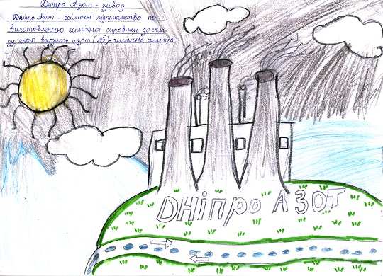 Що я знаю про «ДНІПРОАЗОТ»? Сам азот – це хімічний елемент, якого є чимало в природі і навколишньому світі. Наприклад, дуже багато його в земній корі. Але ще більше – в повітрі, він є головною складовою того, чим ми дихаємо. Ось в місті Кам'янському є і завод під назвою «Азот». Там виробляють аміак, карбамід, кислоти, рідкий хлор. Це відповідальний об'єкт, де не можна допускати аварій, адже це може завдати всім великої шкоди. «Азот», звичайно, корисний, але... У нашому місті багато людей там працюють, але з моєї родини там не працює ніхто.