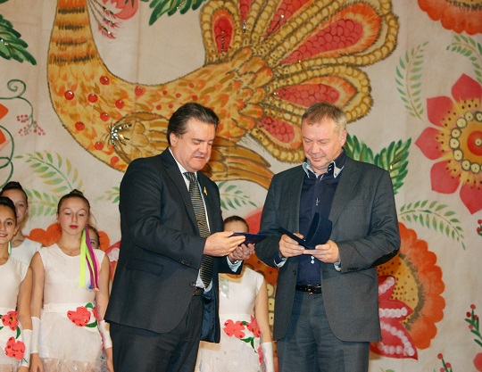 А у фіналі святкової програми народний депутат України О.І.Дубінін, за дорученням голови Дніпропетровської обласної адміністрації В.М.Резніченко, вручив нагрудний знак відзнаки Голові Правління ПАТ «ДНІПРОАЗОТ» С.Л.Сідорову – за те, що в складній економічній і політичній ситуації останніх років Сергію Леонідовичу вдалося зберегти стабільність роботи нашого підприємства, вносить чималий внесок в економіку регіону.