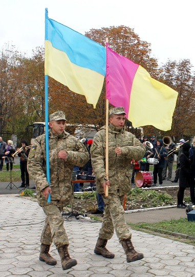 Директор народного музею історії ПАТ «ДНІПРОАЗОТ» Лариса Яківна Орлянська віддає команду до внесення до місця проведення мітингу Державного прапора України та прапора Каменського. Карбуючи крок, група військовослужбовців вносить прапори і завмирає біля плит меморіалу.
