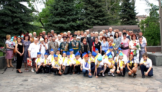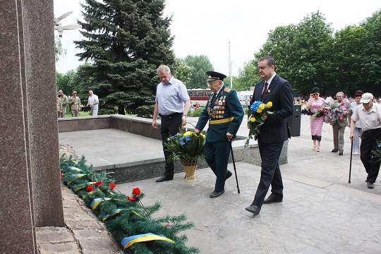 ...Перед ступенями меморіалу покладено гірлянду Пам'яті, встановлені кошики з квітами від «ДНІПРОАЗОТу», ветеранів. Під звуки духового оркестру колона ветеранів крокує до меморіалу, прапороносці несуть Державний прапор України та прапор міста. Колону ветеранів учасники мітингу урочисто зустрічають оплесками, діти дарують ветеранам квіти.